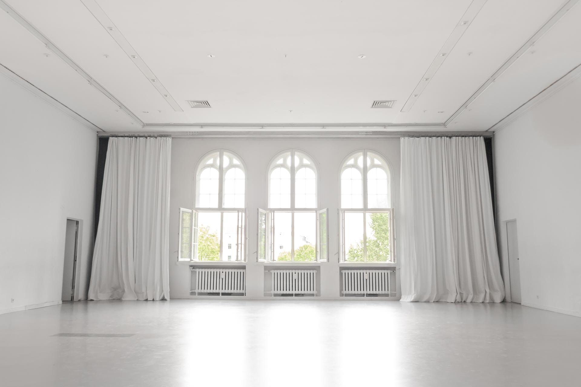 STUDIO2 is a 165 sqm (11 x 15 m / 4.40 m high) and bright rehearsal space with large windows on the second floor of Kunstquartier Bethanien. The light linoleum floor and white walls make the studio a suitable place for rehearsal development and experimental formats. You can see a floor plan of the room here.